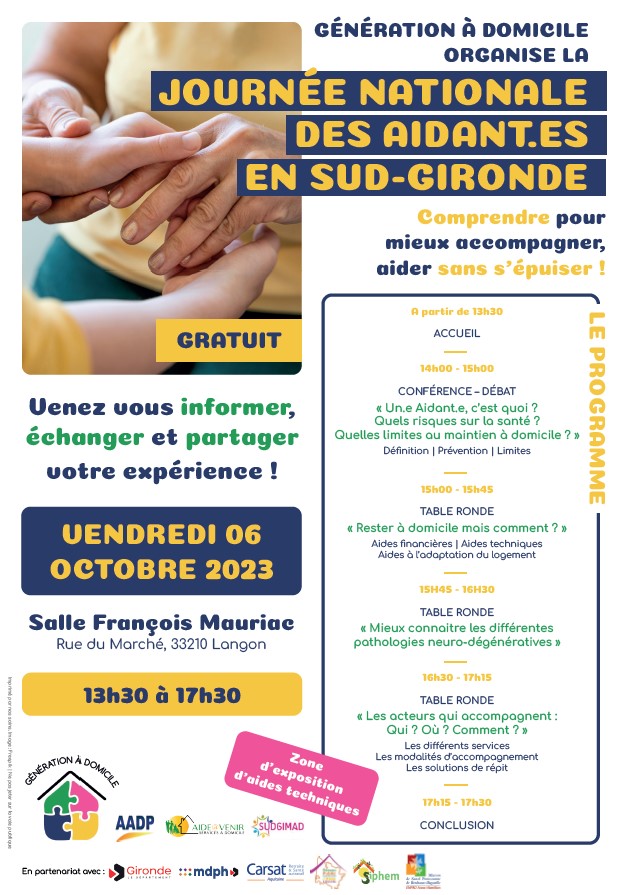 A l'occasion de la journée nationale des aidants familiaux, Génération à Domicile et ses structures membres (AADP – AIDE@VENIR – SUDGIMAD) vous invitent à participer à une après-midi dédiée à la thématique "Comprendre pour mieux accompagner, aider sans s'épuiser !".